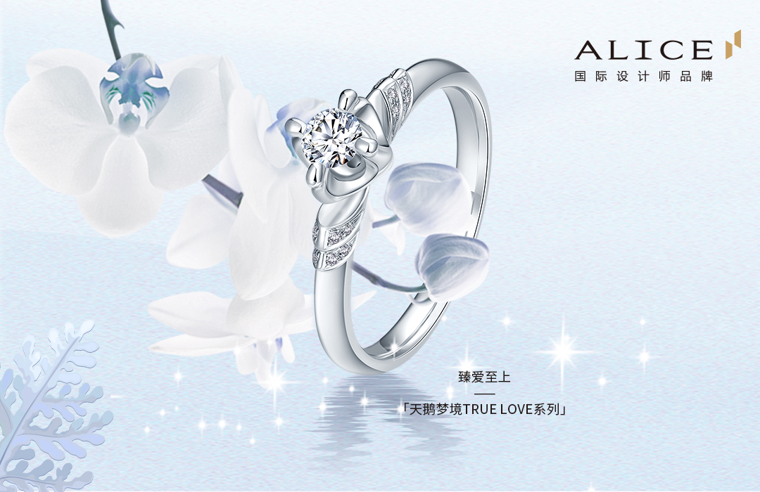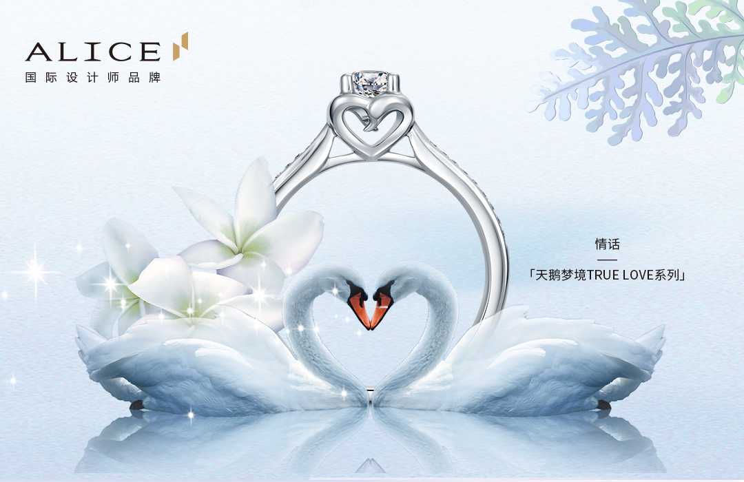 拥有魔幻力量的大自然、神话钟情的完美生物和经久流传的迷人故事,常常能赋予珠宝设计师无尽灵感。“国际设计师品牌”定位的ALICE爱丽丝珠宝,以《天鹅湖》为基调,结合天鹅“一生只有一个伴侣相守一生”的爱情观,全新推出“天鹅梦境·TRUE LOVE”经典婚嫁钻饰,只为送给相信爱情并用心经营的爱侣们。此系列由天鹅公主与齐格弗里德王子约定一生的故事,延伸演绎出“臻爱至上”、“永恒之约”、“奇遇”、“情话”和“包容”等钻石新品。