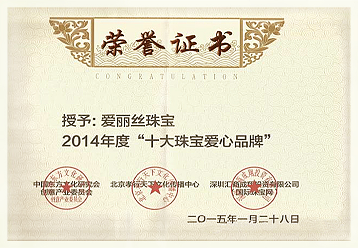 ▲2015年爱丽丝珠宝荣获“十大珠宝爱心品牌”