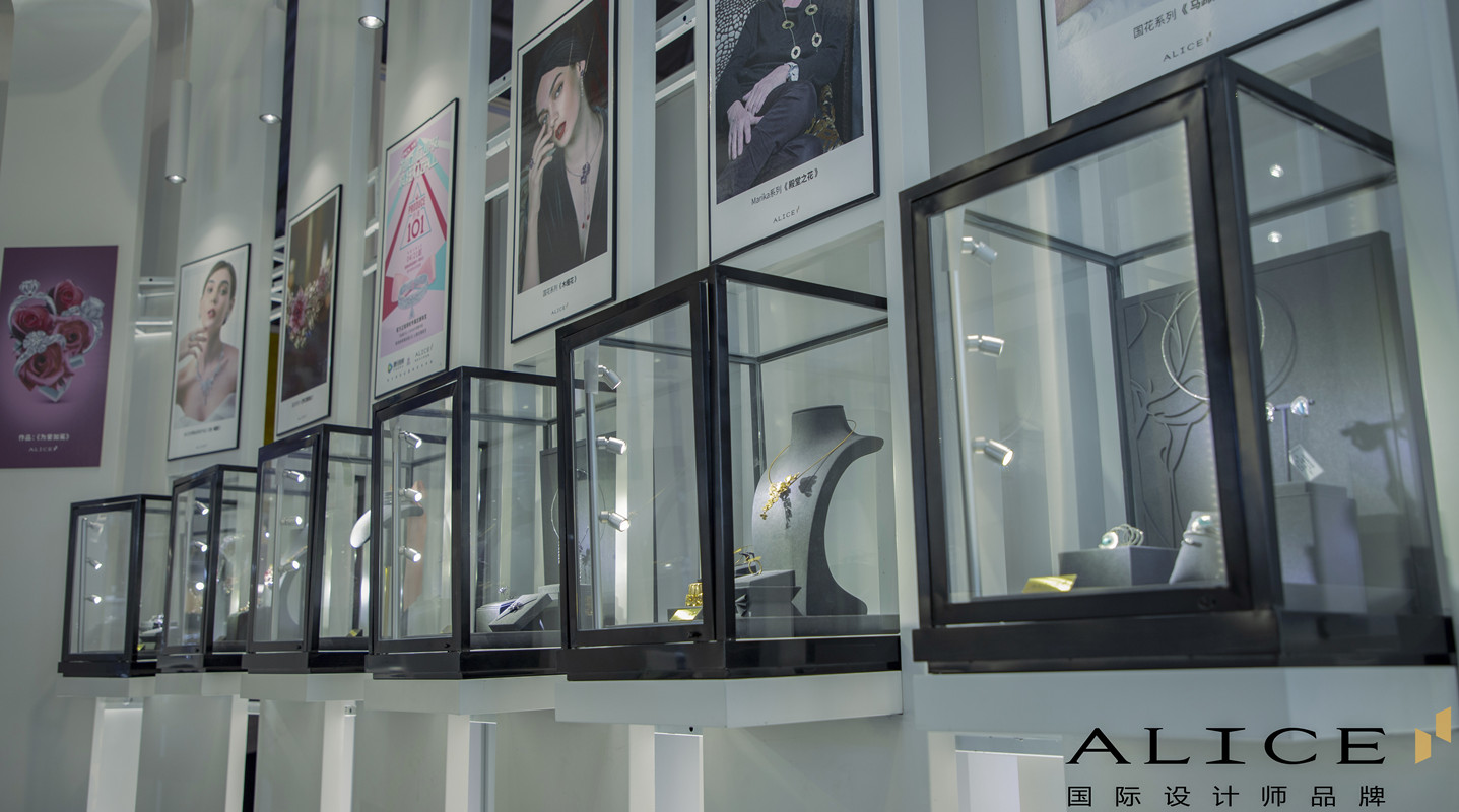 ALICE珠宝店汇聚国际设计师的精心美学的珠宝首饰设计作品,典雅而不乏现代感的装潢风格,与空间陈列完美结合,充分诠释了ALICE爱丽丝珠宝作为一个国际珠宝首饰品牌的大气与奢华,让前来的顾客完完全全享受购物体验,在时尚感观中找寻久违了的生活之美。
