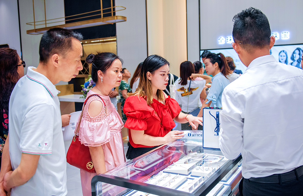 在众多国际一线品牌聚集的场内,ALICE爱丽丝珠宝依然门庭若市,160平米的超大体验店中站满了前来选购珠宝的顾客。各具风情的设计师珠宝以及爱丽丝独有的国花系列都收获了一众珠宝爱好者的喜爱,现场排队结账的队伍排到店面之外,场面异常火爆。