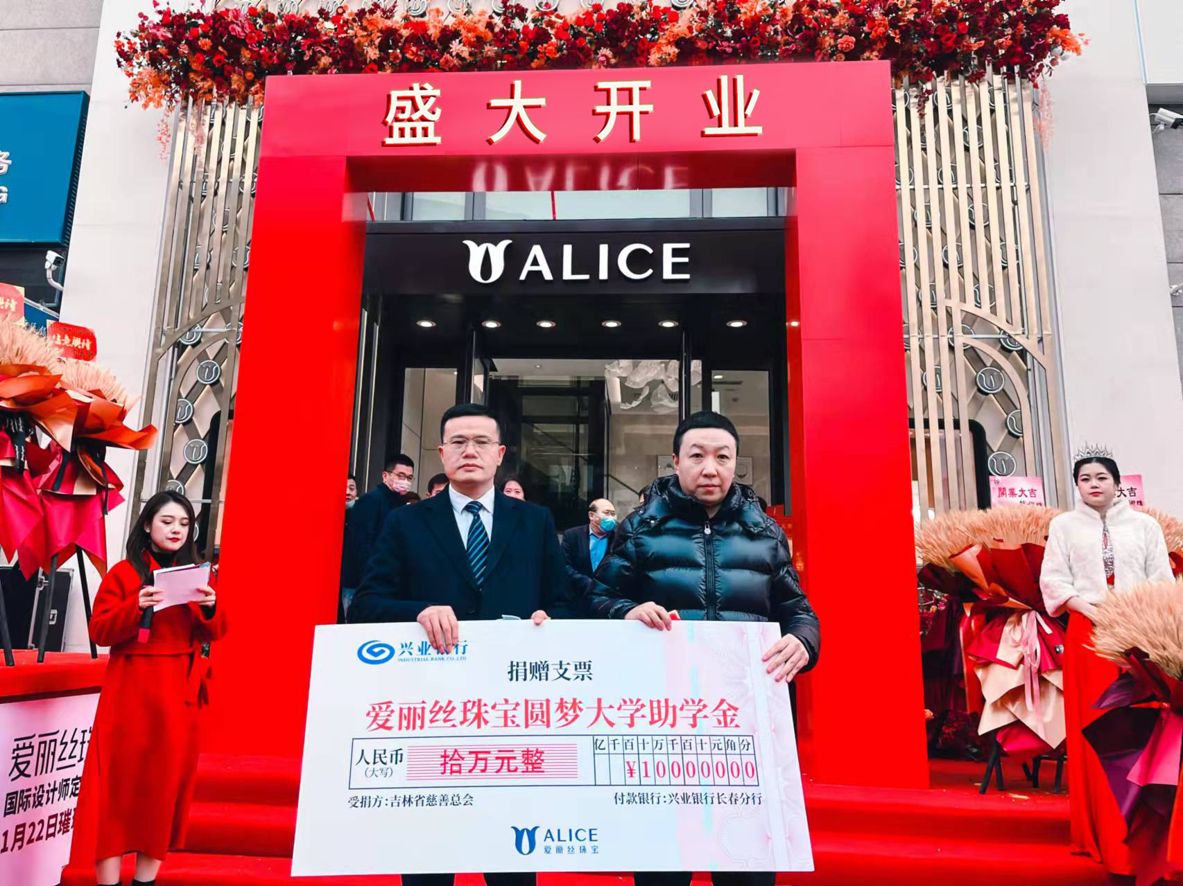 2022年1月22日,爱丽丝珠宝欧亚商都店璀璨开业暨圆梦大学捐赠仪式成功举办,吉林省慈善总会副秘书长邹运与香港爱丽丝珠宝集团董事长郑国阵共同莅临现场助阵。