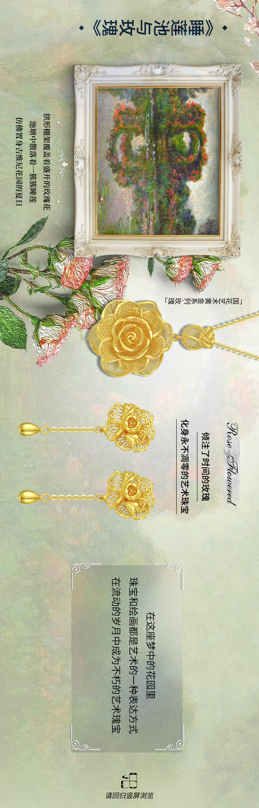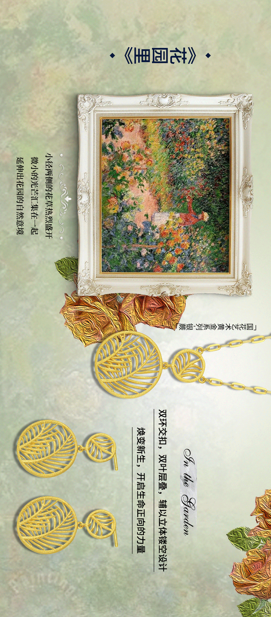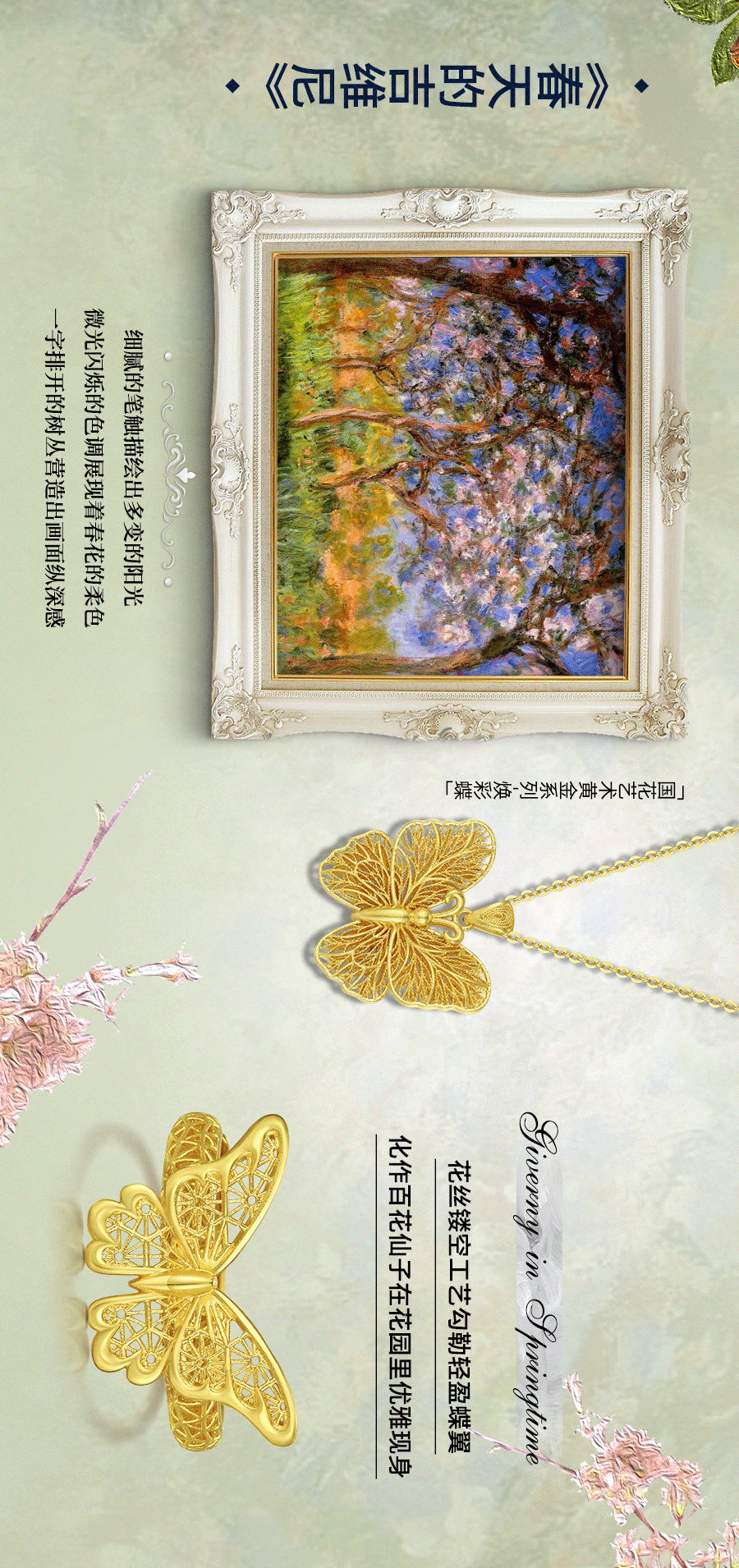 莫奈热衷于描绘大自然的景象将纯美的大自然和淳朴的生活作为创作的灵感题材用色彩和笔触凝固时间和空间把那些转瞬即逝的美好凝固在画里画笔下流动的色彩与变幻的光影点燃了艺术黄金珠宝设计师的艺术灵魂用奇思妙想赋予了黄金珠宝璀璨而神秘的光芒