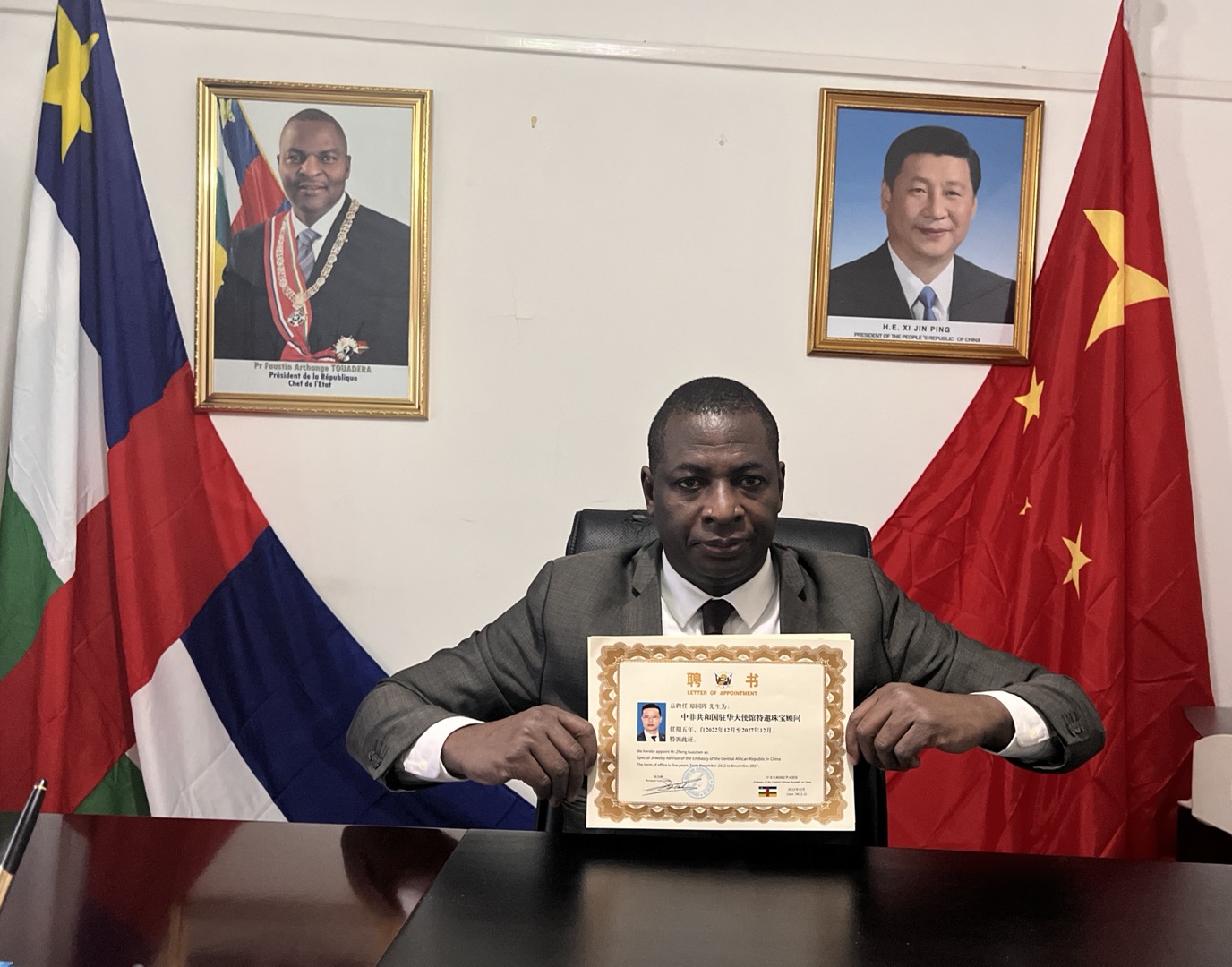 图1-中非共和国驻华大使贝合纳亲自向爱丽丝珠宝集团董事长郑国阵先生颁发聘书